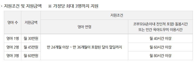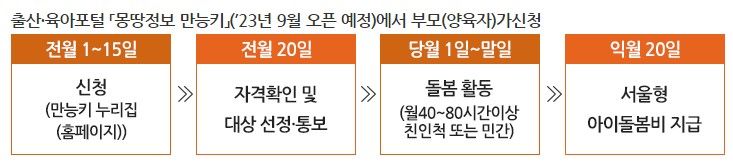 지원대상으로는 주민등록상 서울시에 거주하고 중위소득 기준이 150% 이하의 만 24개월 이상 ~ 만 36개월 이하의 영아를 둔 양육공백 발생가정이 지원대상입니다.