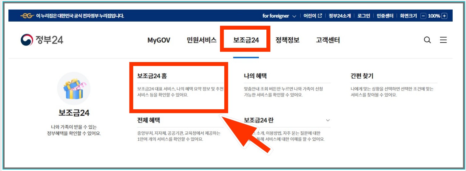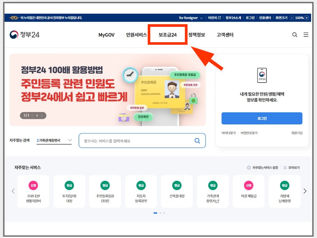 1. 먼저 정부 24홈페이지에 들어가 로그인한후  상단 메뉴 보조금24를 클릭합니다.