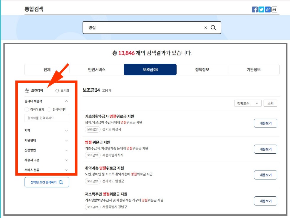 4.  왼쪽 메뉴의 조건검색을 클릭하여 자신이 사는 지역,지원형태,신청방법등 상세결과를 검색해 확인합니다.